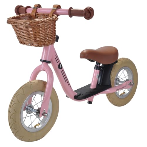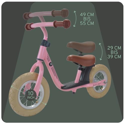 | Features | RETRO-DESIGN: Rosafarbener Rahmen mit weißen Reifen, braunem Sattel und braunen Sicherheitsgriffen für einen klassischen Look., NIEDERIGER EINSTIEG UND TRITTBRETT: Sicher und bequem, ideal für Kinder ab 2 Jahren., WÄCHST MIT: Verstellbarer Sattel (29–39 cm) und Lenker (49–55 cm) für den Langzeitgebrauch., WEIßE LUFTREIFEN: Sorgen für ein sanftes und komfortables Fahrerlebnis., INKLUSIVE LENKERKORB AUS WEIDE: Praktisches und stylisches Accessoire für kleine Entdecker. |