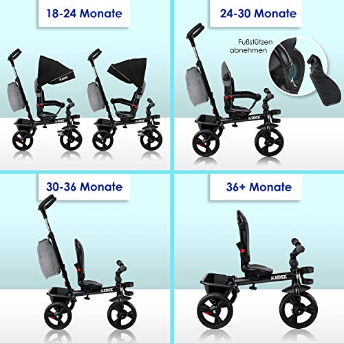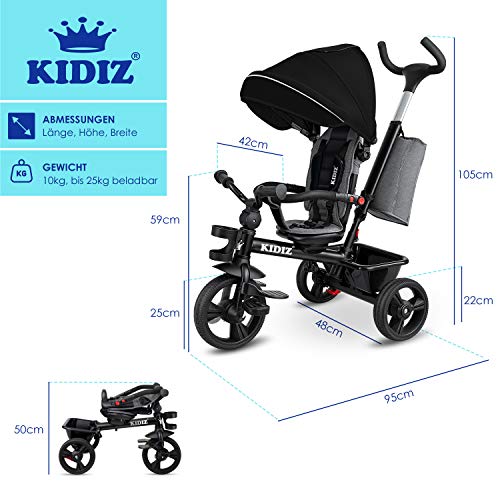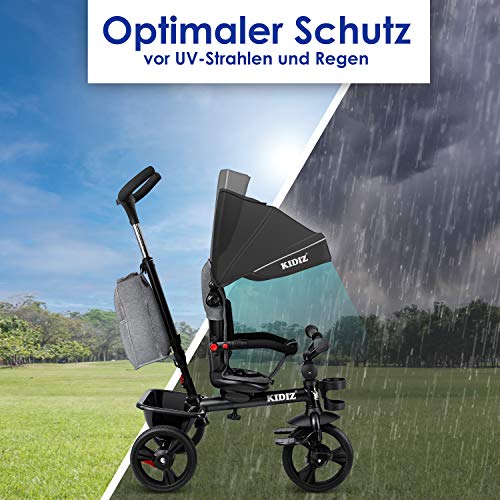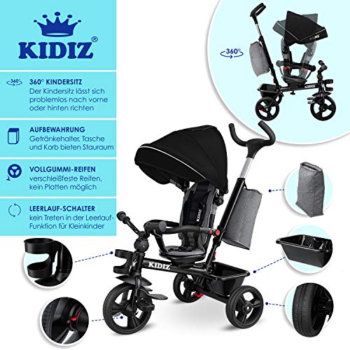 KIDIZ® Dreirad 5in1 Kinderdreirad mit Schubstange Lenksystem Stange ab 1 Jahr, Jogger vorwärts und Rückwärtsfahrt,Korb Tasche Getränkehalter Sonnendach Gummiräder Buggy Fahrrad Baby Klappbar, Schwarz