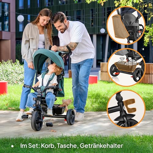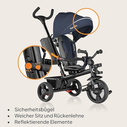 LIONELO Haari 2in1 Dreirad mit Schubstange ab 18 Monate bis 25kg, Vorwärts und Rückwärtsfahrt, schlauchlose Gummireifen, Freilauf geräumiger, Korb, Tasche, Getränkehalter