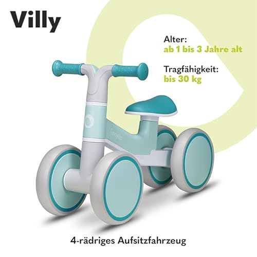 Lionelo VILLY Kinder Laufrad für 12-36 Monate Baby bis 30 kg, Lauflernrad Spielzeug mit 4 Räder, vordere Dämpfung, ergonomischer Sitz, Erst Rutschrad Fahrrad für Mädchen und Jungen